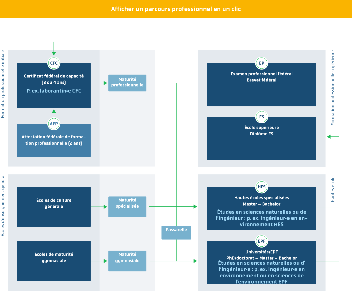 Les spécialistes en environnement sont des expert·e·s recherché·e·s au sein des offices cantonaux de protection de l’environnement ainsi que des administrations fédérales et communales. Ces spécialistes travaillent en outre dans des laboratoires spécialisés dans l’analyse des eaux ou encore au sein de bureaux de planification ou d’écologie aquatique.